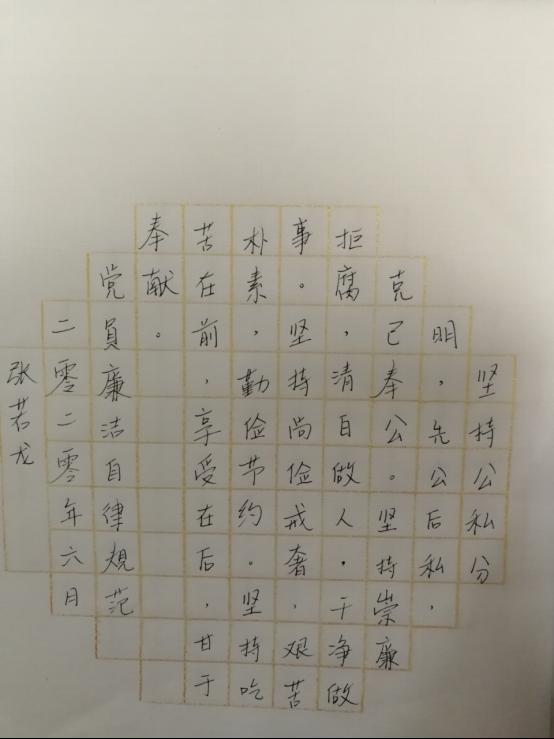 研究生党支部的张若龙用刚劲的硬笔字书写《党员廉洁自律规范》,坚定中国特色社会主义信念,期望弘扬中华传统美德,廉洁自律,永葆党的先进性;