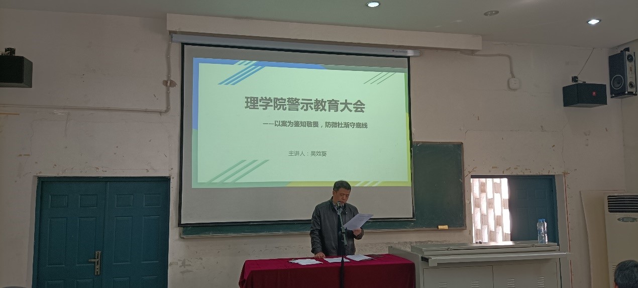 为贯彻落实上级关于进一步加强警示教育的工作部署,积极推进廉洁校园建设,以案明纪、举案说法、警钟长鸣,3月25日,理学院教师于教1栋108召开以“以案为鉴知敬畏、防微杜渐守底线”为主题的警示教育大会。理学院领导及全体教师参加此次大会,理学院党委书记吴效葵主持。